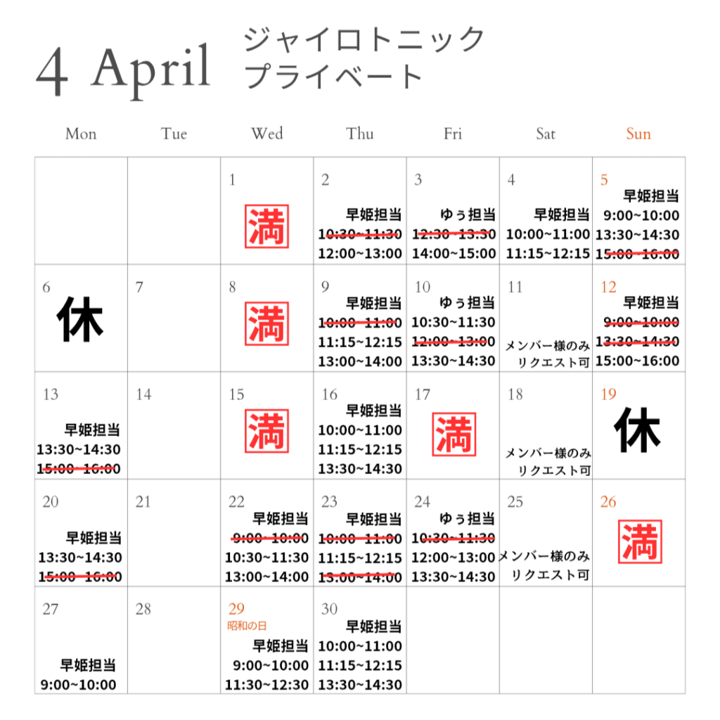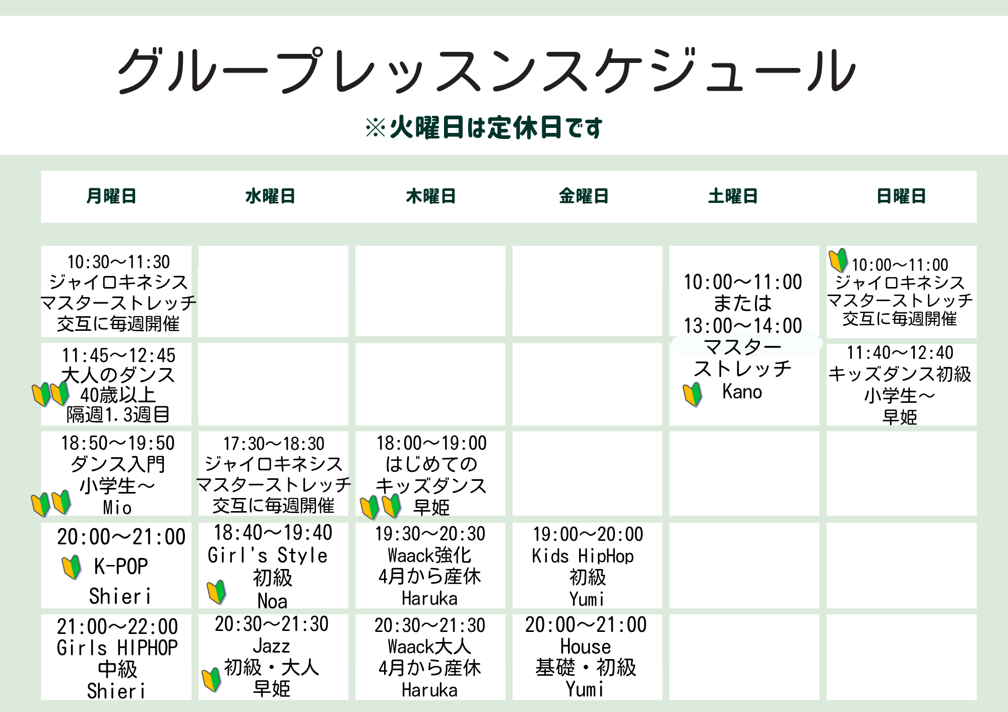 【休講と時間変更】※木曜日Haruka先生のWaackクラスにつきまして、4月から産休に入りますのでしばらくお休みです。